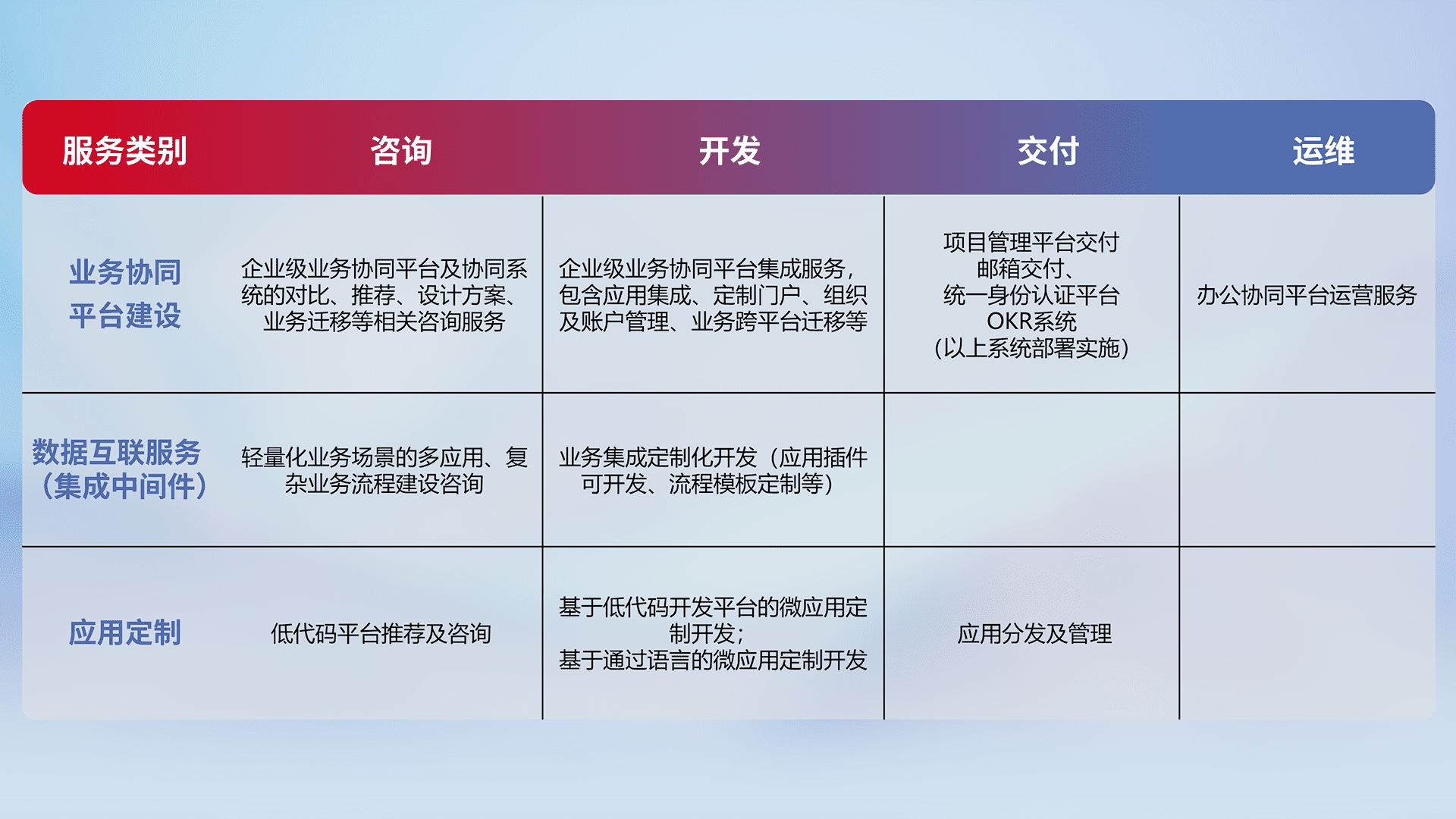 针对钉钉、、企微、、、、IDaas等平台级产品提供产品的规划、、方案、、、、交付、、定制化开发等服务,,实现如统一协同办公、、、智能客户服务、、、、混合会议管理、、、智能数据查询、、等业务场景,,实现数字化转型。。。